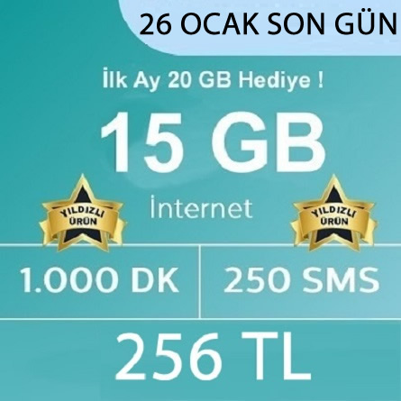 15 GB İNTERNET + 250 SMS + 1000 DK